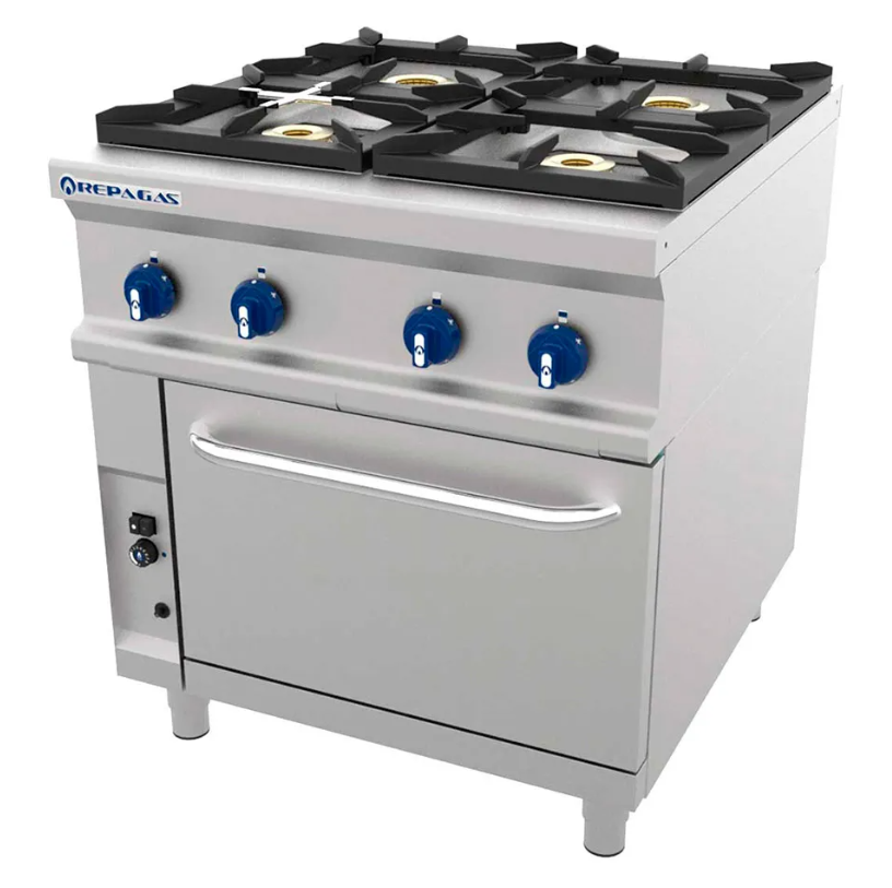 LA COCINA REPAGAS CG-941 POW CON HORNO, DISPONE DE 4 QUEMADORES, 2 X 6,5 Y 2 X 8,0 KW. Y EL QUEMADOR DEL HORNO DE 8 KW.