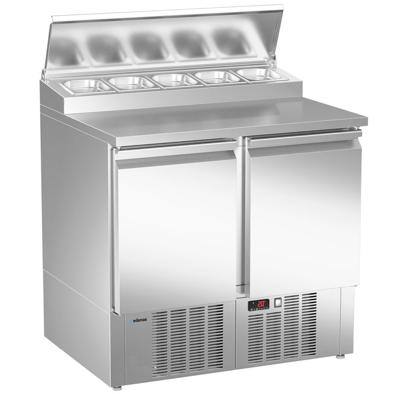 MATERIAL: ENCIMERA DE TRABAJO DE ACERO INOXIDABLE DE 30 MM, INYECTADA CON POLIURETANO LIBRE DE CFC, CON ÁREA ABIERTA PARA CONTENEDORES GN 1/6. CONTENEDORES GN NO INCLUIDOS COMO ESTÁNDAR.